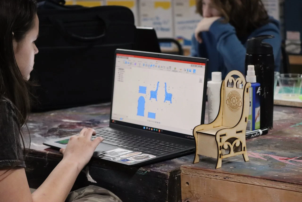 Students learned Autodesk Fusion 360 and modeled the throne in 3D. Before wasting materials on a full-size build, we laser cut a scale prototype.